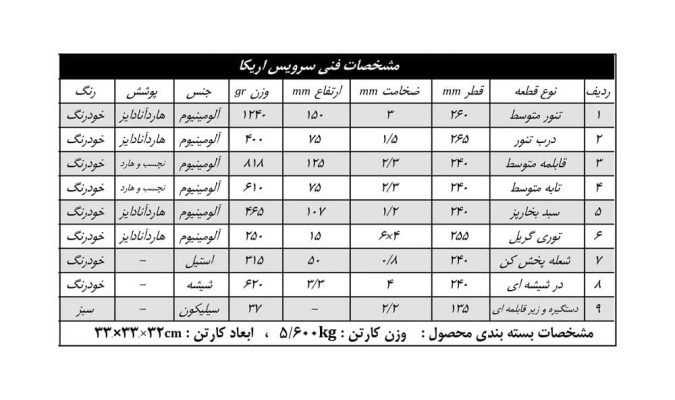 - ارتفاع تنور: ۱۵۰ میلیمتر